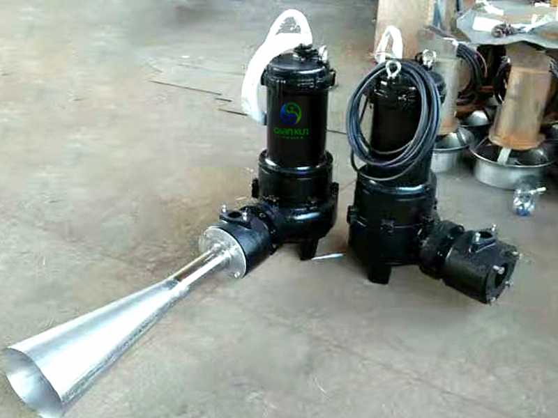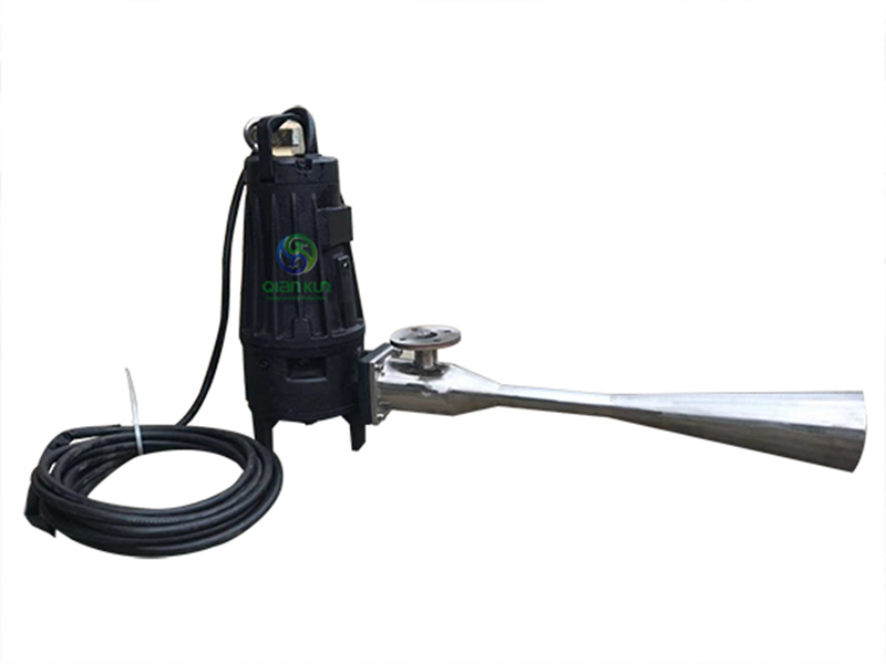 潜水泵工作后产生的水流经过喷嘴后形成高速水流,在混合室内由于喷嘴周围形成负压而吸入空气,空气经喉管与高速水流相遇,被撕碎成微气泡与水形成气水混合液,高速喷射而出,夹带大量气泡的水流在交大的范围内产生强有力的单向液流,从而具曝气、搅拌、推流一体,对推流生化反应池更为适用,同时在曝气过程中,气轴功率的随潜没深度的变化而变化,可以在水位变化较大的池中运用。